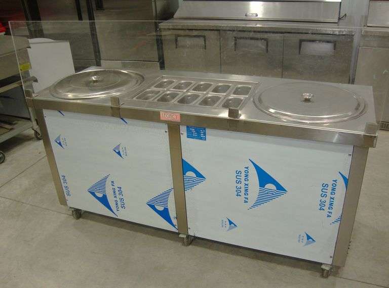 Legacy Double Fried Rolled Ice Cream Machine w/toppings bins and plexi shield on casters, shield can be removed