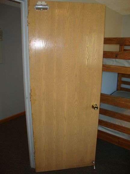 LOT 74 - Lot of 4 Solid 32" Oak Finish LH Doors w/trim, most have openers Make great workbenches too!